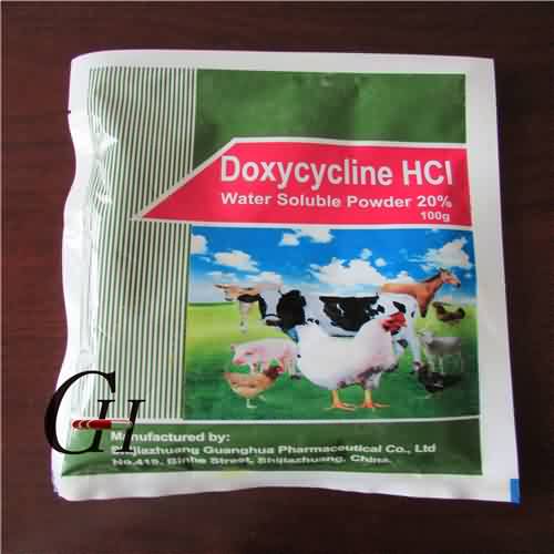 Doxycycline HCL Water Soluble Powder 20% has the effects of broad spectrum antimicrobial, sensitive bacteria. Also has a certain degree of inhibition for mycoplasma, chlamydia, rickettsia, spirochete. Were known as the high lipid solubility and are more likely to penetrate into body tissues and fluids, including cerebrospinal fluid, prostate and the eye.