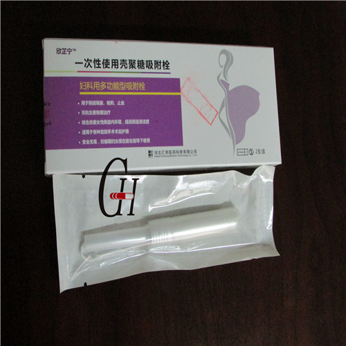 Chitosan Absorption Suppository made up by Chitosan nonwovens, medical absorbent tampon, cotton rope and pusher. Gynecology Disposable Chitosan Absorption Suppository mainly used for vaginal packing, including the adsorption of female vaginal secretions and the gauze tamponade Hemostasis after the cervical Physical therapy surgery.